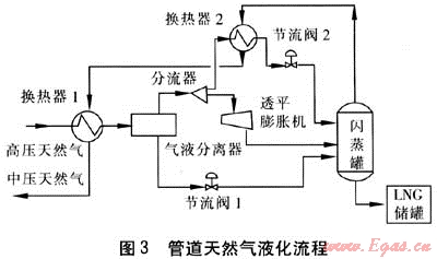 高壓天然氣經(jīng)換熱器1預冷部分液化后,進入氣液分離器,分離出的液相經(jīng)節(jié)流閥膨脹至中壓,溫度降低,形成氣液混合物。分離出的氣相經(jīng)分流器分為兩股,一股進入膨脹機膨脹至中壓,溫度劇降,形成氣液混合物;另一股經(jīng)換熱器2預冷部分液化后,再經(jīng)節(jié)流閥膨脹至中壓后,也形成氣液混合物。三股氣液混合物一起送到閃蒸罐中,分離出氣相天然氣(中壓)和LNG,前者作為原料氣預冷冷源,換熱后進入中壓管網(wǎng),后者進入LNG儲罐儲存。在城市門站安裝帶膨脹機的天然氣液化裝置,用氣低谷時通過膨脹機產(chǎn)生冷量用于天然氣液化。生成的LNG輸入儲罐,用氣高峰時將其氣化起到調(diào)峰作用。
