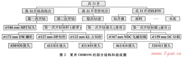 在鉆井過程中,一口井物料的消耗可由鉆井設計所形成的鉆具組合、套管組合、鉆井液和其他主要輔助材料等來確定[6]。將鉆井設計所形成方案中物料的使用及物料之間的關系與傳統(tǒng)制造業(yè)BOM進行對比,可構造出類似于制造業(yè)ERP中BOM的石油鉆井物料清單(Oil Drilling Bill Of Material,即ODBOM)。在ODBOM的構造中,從結構上可將一口井視為一個產品,結構中的第一層以虛項[3]形式分別表示鉆井過程中鉆具組合、套管組合所需使用器材的模塊和消耗材料模塊。其中消耗材料模塊清單由鉆井液、油料、泥漿等組成。而鉆具組合和套管組合中所使用器材的清單結構需根據鉆井開次分別構造。以鉆具組合中各種鉆井器材使用為例,油氣井的施工過程是由多次開鉆順序組成,每次開鉆鉆進過程中所使用的各種鉆井器材等,按照鉆具組合設計,這些器材之間(如鉆頭、鉆鋌、鉆桿等)是以一定的方式形成連接組合關系。下面是某口井第一次開鉆的鉆具組合: