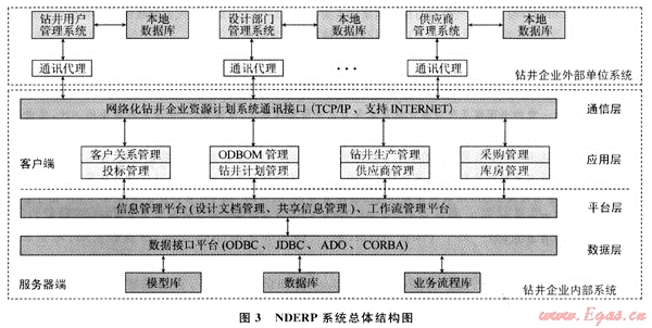 整個系統(tǒng)結構分為企業(yè)外部和企業(yè)內部軟件系統(tǒng)。企業(yè)外部軟件系統(tǒng)包括用戶管理系統(tǒng)、設計部門管理系統(tǒng)和鉆井物資供應商管理系統(tǒng),并通過NDERP系統(tǒng)的通訊接口與企業(yè)內部系統(tǒng)進行信息交換和共享。企業(yè)內部軟件系統(tǒng)由系統(tǒng)管理服務器端和客戶端軟件組成。服務器端分為數據層和平臺層,其中數據層是由面向鉆井企業(yè)資源計劃管理和物資供應的數據庫、模型庫和業(yè)務流程庫組成;平臺層是根據企業(yè)的需求定制相應的工作流、協(xié)同工作、信息交換等,是NDERP系統(tǒng)柔性和協(xié)作性的一個體現方面。客戶端分為應用層和通訊層,其中應用層是由應用軟件系統(tǒng)組成,主要是根據鉆井過程,結合ERP管理思想,實現企業(yè)鉆井物資的計劃制定、合理配置和優(yōu)化管理;通訊層是實現網絡化鉆井的分布式計算平臺和數據信息傳輸平臺。