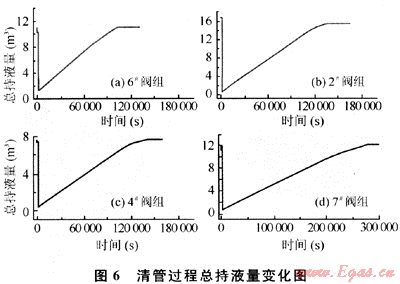 圖6顯示出了清管初始各閥組的總持液量為:11.1m3(6#閥組)、15.6m3(2#閥組)、7.8m3(4#閥組)、11.1m3(7#閥組)。清管后管線內(nèi)的總持液量為:1.6m3(6#閥組)、0.87m3(2#閥組)、0.5m3(4#閥組)、0.71m3(7#閥組)。初始總持液量是管線流體平穩(wěn)后的最大總持液量,而圖形中總持液量的最小值是各閥組經(jīng)過清管后的最小總持液量。清管完成后管線內(nèi)流體重新恢復穩(wěn)態(tài),總持液量又重新達到清管初始值。從圖6中曲線可以看出各閥組重新恢復穩(wěn)態(tài)的時間為:49.2h(6#閥組)、37.5h(2#閥組)、38.9h(4#閥組)、76.5h(7#閥組)。與穩(wěn)態(tài)計算結(jié)果相比較,TACITE瞬態(tài)計算清管重新恢復穩(wěn)態(tài)的時間要比穩(wěn)態(tài)大得多,這主要是因為TACITE對組分變化的準確瞬態(tài)跟蹤功能使計算結(jié)果更加嚴謹。