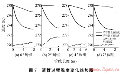 分析,獲取了清管后各閥組管線恢復穩(wěn)態(tài)的時間。采用瞬態(tài)分析方法對清管器運行中溫度變化研究的結(jié)論表明:各閥組在清管過程中沒有天然氣水合物的形成。進一步驗證了清管節(jié)流理論的正確性。