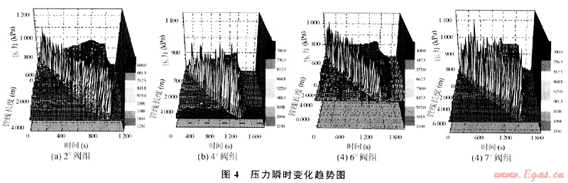 各閥組由于地形變化起伏大,壓力波動隨著管線的起伏也發(fā)生了較大的變化(見圖4)。從圖中可以看到壓力波動的位置出現(xiàn)在段塞出現(xiàn)處和管線走向發(fā)生改變的地方。在通球過程中各閥組流體壓力變化具有共同的特征:當清管器放入管道后,由于清管器后部流體被阻,上游氣體被壓縮使清管器上游壓力急劇升高,清管器運動后,上游重新恢復到新的穩(wěn)態(tài);清管器下游由于流體連續(xù)性的中斷,開始時下游流體壓力急劇下降,清管器經(jīng)過后,由于氣體得以補充,原下游下降的壓力開始上升。清管器剛經(jīng)過時,在清管器上游一定長度的管段內(nèi)幾乎沒有液體存在,使清管器上游壓力幾乎相等,僅由于阻力損失使壓力出現(xiàn)微小的差別;當清管操作完成后,各管段經(jīng)過一段時間重新達到了新的穩(wěn)態(tài)。