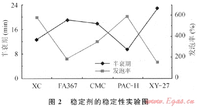 根據(jù)實(shí)驗(yàn)結(jié)果,穩(wěn)定劑CMC的加入對(duì)發(fā)泡率的影響較小,且具有良好的穩(wěn)定能力;XC和PAC-H的加入雖然提高了半衰期,但發(fā)泡率較低;FA367和XY-27的穩(wěn)定能力差。實(shí)驗(yàn)最終優(yōu)選CMC作為體系的穩(wěn)定劑。