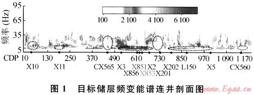 圖1所示是新場T511層頻變能譜連井剖面,重點(diǎn)關(guān)注的頻譜在橢圓區(qū)內(nèi)。圖中顯示,在該儲層段內(nèi),獲得高產(chǎn)工業(yè)氣流的X10、X3、X856、X851、X853、X2、X202等井在低頻段(低于15Hz)具有較強(qiáng)的瞬時譜響應(yīng);獲得低產(chǎn)工業(yè)氣流的IA50、X5等井在低頻段(低于15Hz)具有相對較弱的瞬時譜響應(yīng);未獲工業(yè)氣流的干井X11、CX560井和產(chǎn)水的CX565、X201井在低頻段無強(qiáng)瞬時譜響應(yīng)特征。