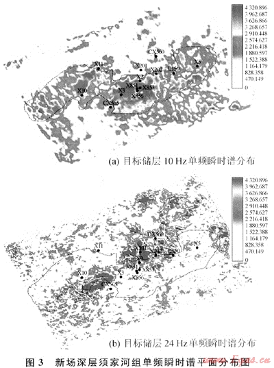 圖3所示是新場地區(qū)深層須家河組單頻瞬時譜平面分布情況,其顯示的瞬時譜具有十分明顯的差異。在圖3-a中,低頻強(qiáng)瞬時譜區(qū)域(紅色)包括了所有天然氣高產(chǎn)工業(yè)井,低產(chǎn)井分布在低頻弱瞬時譜區(qū)域(淺藍(lán)色),水井分布區(qū)域低頻瞬時譜更弱(白色)。在圖3-b中的多邊形框內(nèi),高頻強(qiáng)瞬時譜是泥巖響應(yīng),而高頻弱瞬時譜是有效砂巖儲層響應(yīng)。雖然,含氣儲層和含水儲層在高頻段有相似的響應(yīng)特征,但是,結(jié)合已知井信息,將圖3-a與圖3-b進(jìn)行仔細(xì)對比,就可以發(fā)現(xiàn)含氣儲層和含水儲層具有不同的時頻響應(yīng)規(guī)律。