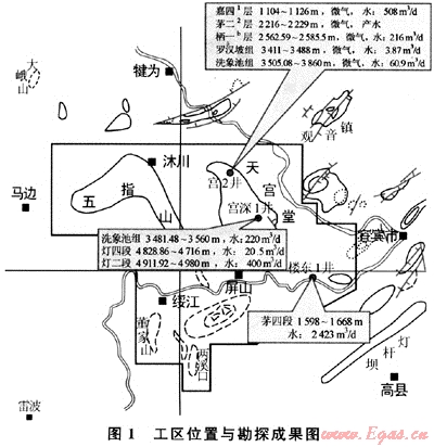 五指山構(gòu)造區(qū)位于四川盆地西南邊緣,區(qū)域構(gòu)造屬于四川盆地川中隆起平緩構(gòu)造區(qū)及川東南坳陷帶,西鄰峨眉-涼山斷塊帶,北部緊鄰大窩頂鼻狀構(gòu)造,東側(cè)為自流井凹陷帶和威遠(yuǎn)-龍女寺繼承隆起帶,南部為川滇黔鄂臺坳的婁山斷褶帶。區(qū)內(nèi)僅在天宮堂構(gòu)造完鉆了宮2井、宮深1井,樓東構(gòu)造上完鉆了樓東1井,測試均未獲得工業(yè)油氣流,但其鄰區(qū)的宜賓、大塔場、觀音場、麻柳場等構(gòu)造在二疊、三疊系均獲得了工業(yè)油氣流(圖1)。
