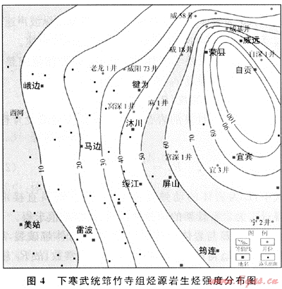 根據(jù)區(qū)內(nèi)烴源巖情況,選用殘余有機碳法計算烴源巖的生烴強度。區(qū)內(nèi)4套烴源巖的平均生烴強度計算結(jié)果分別為:下寒武統(tǒng)筇竹寺組為63×108m3/km2、下志留統(tǒng)龍馬溪組為44.5×108m3/km2、下二疊統(tǒng)為11.5×108m3/km2、下三疊統(tǒng)嘉陵江組為0.85×108m3/km2。各烴源層生烴強度的展布特征如下:下寒武統(tǒng)筇竹寺組烴源巖生烴強度高值區(qū)位于工區(qū)北東側(cè)的榮縣-威遠(yuǎn)-自貢一帶,最大生烴強度為100×108m3/km2,平均生烴強度位于珙縣-屏山-犍為-樂山一帶(圖4);下志留統(tǒng)龍馬溪組烴源巖生烴強度高值區(qū)位于工區(qū)東南側(cè)的宜賓-筠連一帶,最大生烴強度為100×108m3/km2,平均生烴強度位于美姑-綏江-自貢一帶(圖5)。