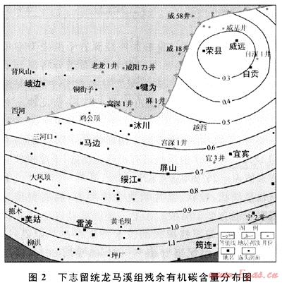 下寒武統(tǒng)筇竹寺組烴源巖殘余有機碳含量平均為0.78%,平面上,殘余有機碳高值區(qū)分布在屏山-沐川一帶;下志留統(tǒng)龍馬溪組烴源巖殘余有機碳平均含量最高,為1.31%,殘余有機碳分布由于受樂山-龍女寺隆起的影響具有由南向北降低的趨勢,但區(qū)內(nèi)殘余有機碳含量均大于0.6%(圖2);下二疊統(tǒng)烴源巖包括泥質(zhì)烴源巖和碳酸鹽巖烴源巖,下二疊統(tǒng)泥質(zhì)烴源巖殘余有機碳含量分布具有工區(qū)中部高,四周低的特征,在沐川-馬邊一帶殘余有機碳含量高,為7%~8%;碳酸鹽巖烴源巖殘余有機碳含量高值區(qū)分布在犍為一帶,為0.9%~1.0%,其低值區(qū)分布在峨邊-雷波抓抓巖一帶,為0.1%~0.3%。下三疊統(tǒng)嘉陵江組碳酸鹽巖殘余有機碳含量普遍較低,在區(qū)內(nèi)具有一定的生烴能力。
