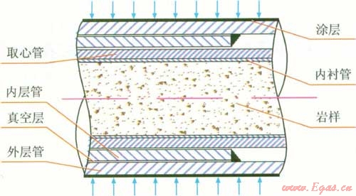 系統(tǒng)保溫筒設(shè)計(jì)如圖2,采用超高真空絕熱方式,在內(nèi)層管、外層管間抽真空;高真空層內(nèi)外表面噴涂等離子隔熱材料;外層管表面涂防陽光輻射涂料;在取心筒外面直接用保溫材料實(shí)施保溫。保溫結(jié)構(gòu)設(shè)計(jì)簡單,現(xiàn)場可操作性強(qiáng),使用方便。