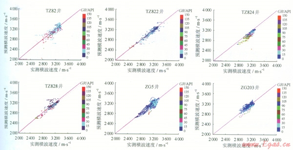 圖3 塔中地區(qū)6口井實(shí)測(cè)橫波與Xu—White模型預(yù)測(cè)橫波交會(huì)圖