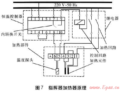 指揮器加熱器結(jié)構(gòu)簡(jiǎn)單,主要由加熱部件(見(jiàn)圖6)、恒溫控制器和繼電器三部分組成,其中恒溫控制器和繼電器只能安裝在非防爆區(qū)域,通過(guò)導(dǎo)線對(duì)加熱部件進(jìn)行連接,加熱部件則通過(guò)配件安裝在調(diào)壓器指揮器上游信號(hào)管上,通過(guò)加熱部件中的加熱元件對(duì)指揮器信號(hào)管內(nèi)的燃?xì)膺M(jìn)行加熱。指揮器加熱器是通過(guò)不同的元器件的綜合作用達(dá)到自動(dòng)控制加熱的目的,原理見(jiàn)圖7,圖中的數(shù)字1~10為開(kāi)關(guān)接線端子編號(hào),接線時(shí)按圖7要求,其中2、5端子為備用。設(shè):