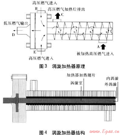 高壓燃?xì)馔ㄟ^(guò)渦漩先導(dǎo)燃?xì)饧訜崞?以下簡(jiǎn)稱(chēng)渦漩加熱器)時(shí),渦漩加熱器將燃?xì)鉁p壓產(chǎn)生的能量轉(zhuǎn)化成高溫?zé)釟饬?,然后利用高溫?zé)釟饬鲗?duì)調(diào)壓器指揮器進(jìn)行加熱。