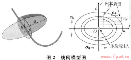 線網(wǎng)模型為半解析模型(圖2),泄流區(qū)域呈橢圓形,有兩組垂直正交的裂縫分別平行于橢圓平面上兩個(gè)主應(yīng)力(σh、σH),為避免裂縫間距的主觀性,dx、dy依據(jù)實(shí)際測(cè)試數(shù)據(jù)確定,橢圓的長(zhǎng)短軸a和b以及高度h由微地震結(jié)果給出。