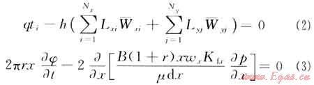 式中q為壓裂液量,m3/d;ti為壓裂液排量,m3/min;Lxi、Lyj分別為x和y方向裂縫段長(zhǎng)度,m;Wxi、Wyi分別為x和y方向裂縫段寬度,m;Kfx、Kfy分別為x和y方向裂縫滲透率,mD;r為橢圓的寬高比;B為橢圓積分。