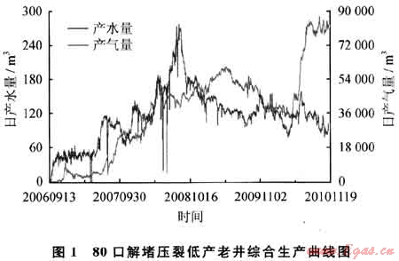 針對煤層氣排采過程中煤層滲透性低、易造成煤粉堵塞的情況,為恢復(fù)儲層滲透性、提高低效井單井產(chǎn)量,開展了低產(chǎn)井大液量、高排量壓裂增產(chǎn)技術(shù)。特別是2008年以來,針對不同的傷害原因,結(jié)合煤巖結(jié)構(gòu)特征,開展了不同規(guī)模的二次重復(fù)壓裂試驗研究,逐步發(fā)展完善形成了自己特有的二次壓裂解堵性壓裂增產(chǎn)技術(shù)。該技術(shù)可有效清除近井地帶的煤粉沉積、改善因應(yīng)力變化而發(fā)生變形或者閉合的微孔隙,重新建立起與遠(yuǎn)端溝通的通道;同時還可有效地解除氣鎖和膠結(jié)的煤粉的影響,防止煤層的進(jìn)一步垮塌。2009年底至2010年規(guī)模實施二次壓裂解堵井80口(圖1),平均單井日增產(chǎn)1000m3左右。目前煤層氣解堵性壓裂工藝技術(shù)已經(jīng)從局部實驗階段走向全面現(xiàn)場應(yīng)用階段,具有較強的適應(yīng)性和針對性,取得了較好的增產(chǎn)效果和可觀的經(jīng)濟(jì)效益。