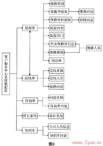 數(shù)據(jù)庫數(shù)據(jù)為樹狀結(jié)構(gòu),數(shù)據(jù)之間的關系為一對一、一對多和多對多的關系,關系清楚明了。數(shù)據(jù)結(jié)構(gòu)圖中列出了數(shù)據(jù)庫中主要的數(shù)據(jù)模塊,每個數(shù)據(jù)模塊中還包含多個相關的數(shù)據(jù)或數(shù)據(jù)選項。其中接報單、接報單驗收、維修材料驗收、作業(yè)維修員信息、回訪單、巡線單、咨詢單、其它事件、知識庫是業(yè)務數(shù)據(jù)表,記錄業(yè)務發(fā)生的過程和結(jié)果,其它是基本編碼表,描述業(yè)務實體的基本信息和編碼。數(shù)據(jù)庫中還有幾張系統(tǒng)信息表,存放與系統(tǒng)操作、業(yè)務控制有關的參數(shù),如用戶權(quán)限、用戶配置信息、地址班組關系表、管線地區(qū)關系表等。