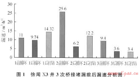 上述3次堵漏前后漏速統(tǒng)計(jì)結(jié)果如圖1所示,由圖1可知每次橋接堵漏之后循環(huán)時(shí)漏速降低,鉆進(jìn)后漏速增高,說(shuō)明新鉆地層裂縫、孔隙較為發(fā)育,也存在一定程度的漏失,3次橋接堵漏之后,正常鉆進(jìn)時(shí)漏速由11m3/h降至3.4m3/h,說(shuō)明橋接堵漏起到了一定的效果。