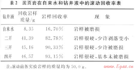 按照石油天然氣行業(yè)標準SY/T 5613—2000《泥頁巖理化性能試驗方法》中的標準滾動回收率法評價了群6井失穩(wěn)井段(4400~4500m)的泥頁巖在不同的鉆井液及自來水中的滾動回收率,分析其在不同介質(zhì)中的分散性。實驗結(jié)果如表2所示。