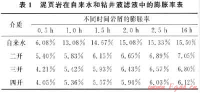 將群6井失穩(wěn)井段(4400~4500m)泥頁巖巖屑樣品烘干后粉碎成粉末,用100目分樣篩過篩,收集100目篩下的巖屑粉末。取該粉末10.0g于頁巖膨脹性測定儀的樣品筒中,在4.1MPa壓力下壓5min,然后放入頁巖膨脹性測定儀中,在室溫條件下,測定樣品在自來水和鉆井液濾液中的浸泡不同時間后巖心的總高度及巖心的膨脹率。室內(nèi)模擬配制了第二次開鉆(以下簡稱二開)、第三次開鉆(以下簡稱三開)及第四次開鉆(以下簡稱四開)鉆井液體系,配方采用現(xiàn)場配方。實驗結(jié)果如表1所示。