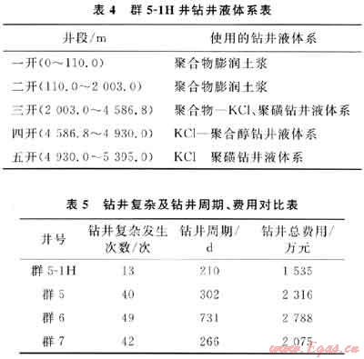 群5-1H井鉆井技術難度主要表現(xiàn)為:三開后,隨著裸眼段的延長,容易發(fā)生井壁坍塌。同時,由于鉆井液密度的提高,容易引起鉆井液中有害固相增加,造成鉆具遇卡和下套管遇阻。為此,對該井采用了分井段鉆井液技術設計(表4)。