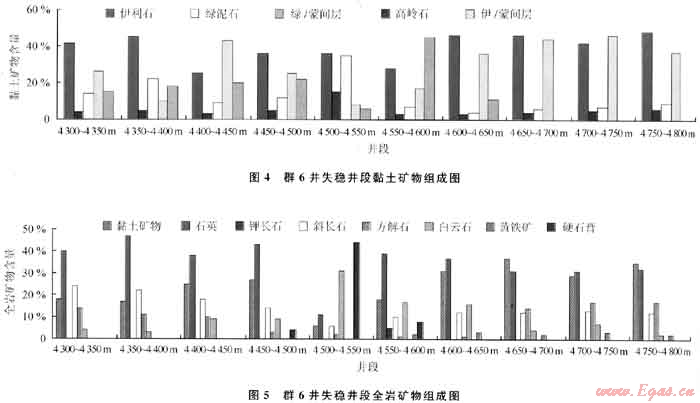由圖5可以看出,群6井失穩(wěn)井段的全巖礦物以石英(相對含量介于11%~47%)、黏土礦物(相對含量介于6%~37%)、斜長石(相對含量介于6%~24%)、方解石(相對含量介于1%~17%)、白云石(相對含量介于3%~31%)為主,還含少量的鉀長石、石膏和黃鐵礦,缺失方沸石、菱鐵礦和鹽巖。同時處于4500~4550m井段的地層硬石膏相對含量較高,達到了44%,屬石膏泥巖層,當鉆井過程中鉆遇到該地層時,鉆井液液柱壓力不能平衡地層坍塌壓力,地層在地層坍塌壓力作用下向井眼擠壓,或者鉆井液中抗鹽抗鈣處理劑加量不足,使石膏吸水膨脹、分散,從而造成井下坍塌、掉塊、卡鉆等鉆井復雜事件。