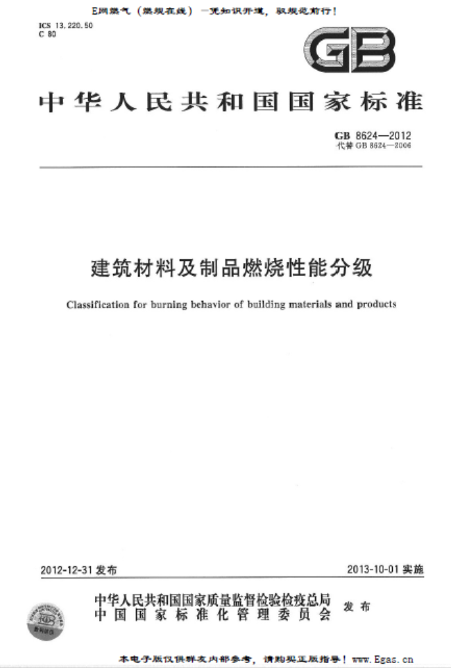 建筑材料及制品燃燒性能分級(jí)GB 8624-2012:本標(biāo)準(zhǔn)規(guī)定了建筑材料及制品的術(shù)語(yǔ)和定義、燃燒性能等級(jí)、燃燒性能等級(jí)判據(jù)、燃燒性能等級(jí)標(biāo)識(shí)和檢驗(yàn)報(bào)告。