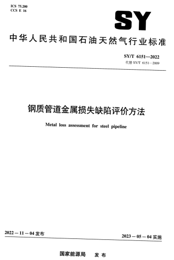 SY/T 6151-2022 鋼質(zhì)管道金屬損失缺陷評價方法:本文件規(guī)定了在役鋼質(zhì)油氣管道腐蝕、劃痕、制造缺陷等金屬損失缺陷的評價技術(shù)要求。