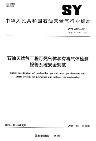 石油天然氣工程可燃?xì)怏w和有毒氣體檢測報(bào)警系統(tǒng)安全規(guī)范SY/T 6503-2022:本文件規(guī)定了石油天然氣工程中可燃?xì)怏w和有毒氣體檢測點(diǎn)的確定,探測器、報(bào)警控制單元和現(xiàn)場警報(bào)器的選用、安裝、檢查、維護(hù)、檢定及報(bào)廢等基本要求。